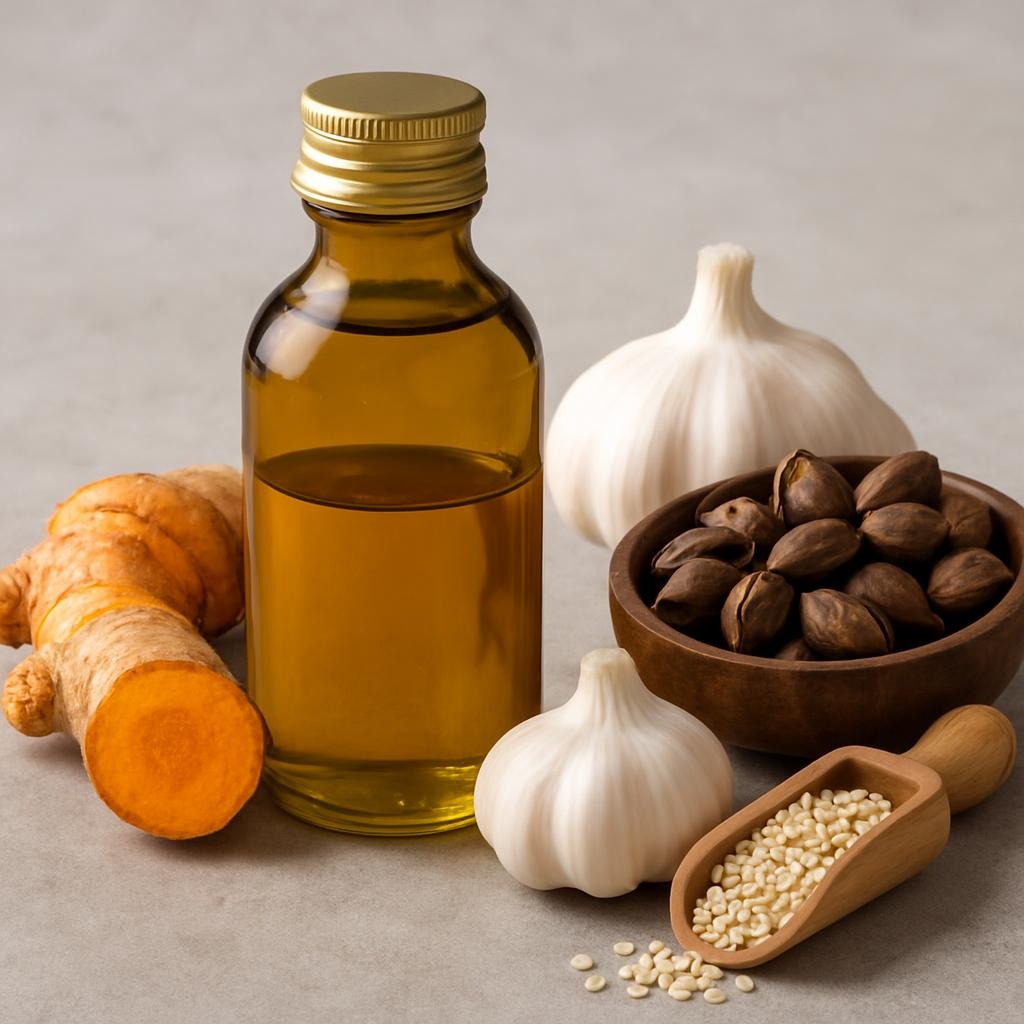 Curcumin, gurkmejans mest aktiva förening, är en potent antioxidant som neutraliserar fria radikaler och skyddar cellerna från åldrande och skador. Eftersom curcumin har låg biotillgänglighet rekommenderas att kombinera det med svart sesamolja, vilket kan öka upptaget av curcumin med upp till 2 000 %.